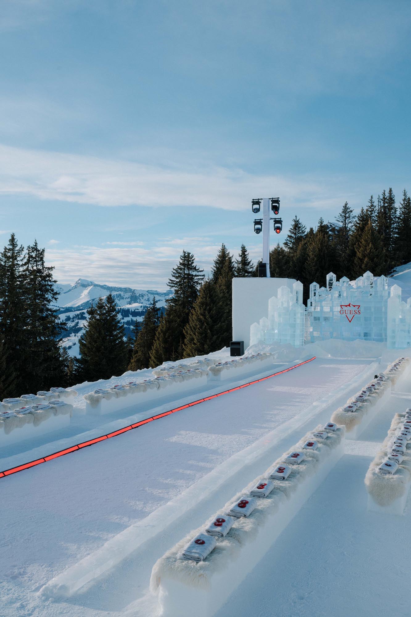Przezroczyste, krystaliczne struktury przywodziły na myśl minerały i formacje kwarcowe wyłaniające się ze śniegu, a odblaskowe powierzchnie wzmacniały niuanse złotego światła, podkreślając ruch, głębię i rytm. Czerwone oświetlenie LED oraz charakterystyczne akcenty GUESS subtelnie podkreślały tożsamość marki, harmonijnie wpisując się w naturalne, śnieżnobiałe otoczenie, bez przyćmiewania jego pierwotnego piękna. Całość łączyła minimalistyczny design z wyrazistą obecnością wizualną, inspirowaną rzeźbionym lodem i śniegiem.