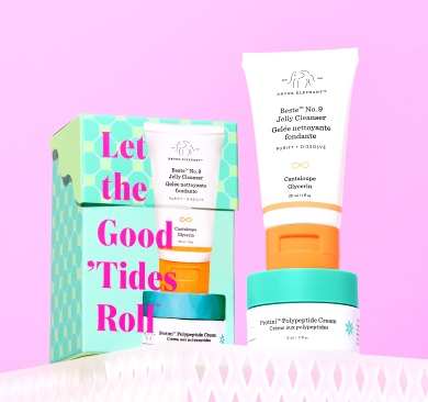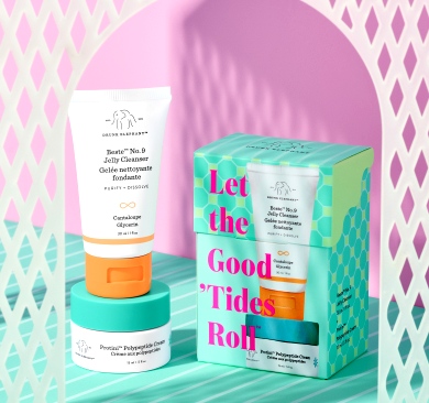 Dzięki produktom do pielęgnacji twarzy Let the Good 'Tides Roll marki Drunk Elephant możesz przygotować swoją skórę na wakacje. Ten podróżny duet składa się z oczyszczającego żelu do mycia twarzy i lekkiego nawilżającego kremu. Żel do mycia twarzy Beste No. 9 usuwa wszelkie ślady makijażu, nadmiar sebum i zanieczyszczenia nagromadzone w ciągu dnia, natomiast krem do twarzy Protini codziennie nawilża skórę oraz poprawia wygląd i teksturę cery.