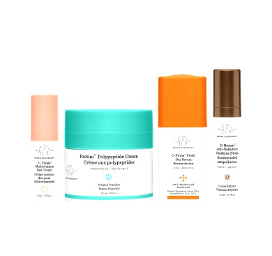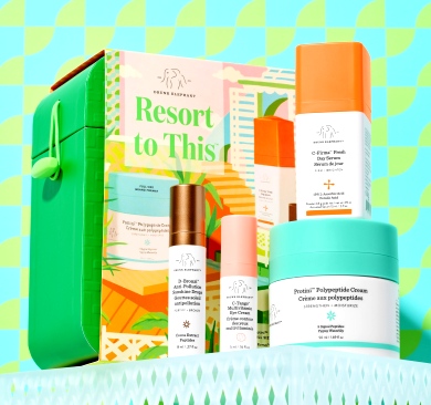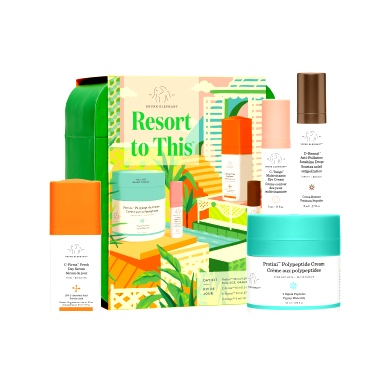 Zestaw do pielęgnacji na dzień Resort to This marki Drunk Elephant zapewnia kompleksową pielęgnację (w tym krem do twarzy Protini!), pomagając uzyskać jaśniejszą, jędrniejszą i zdrowiej wyglądającą skórę, jak po urlopie. Krem Protini codziennie nawilża skórę i poprawia wygląd cery i teksturę skóry, serum C-Firma rozjaśnia i ujędrnia, krople brązujące D-Bronzi™ nadają jej efektu naturalnej opalenizny, a krem pod oczy C-Tango rozjaśnia i wzmacnia skórę wokół oczu.