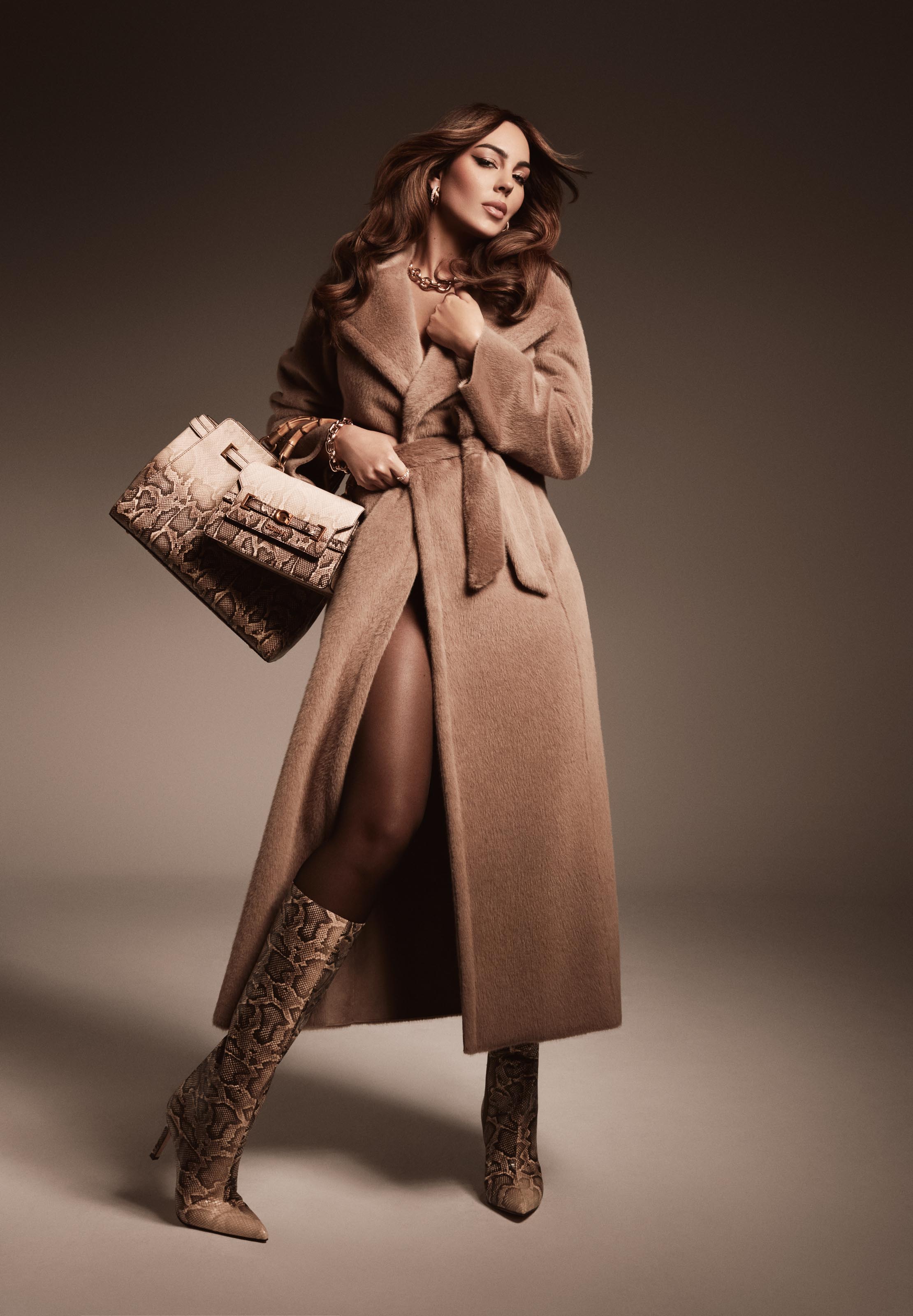 Pełna mocy, wyrafinowania i dopracowana w każdym detalu kampania, prezentuje Georginę w kluczowych elementach kolekcji Holiday. W sfotografowanych stylizacjach wyróżniają się: luksusowy, sięgający kostek, zimowy płaszcz z szerokim kołnierzem i paskiem, kozaki za kolano ze zwierzęcym nadrukiem, efektowna, puszysta kurtka, jedwabna sukienka z drapieżnym motywem, szpilki, a także dopasowane torebki i akcesoria. Seria kolorowych i czarno-białych zdjęć cechuje się minimalistycznym, lecz ciepłym klimatem, który podkreśla magiczny blask sezonu.