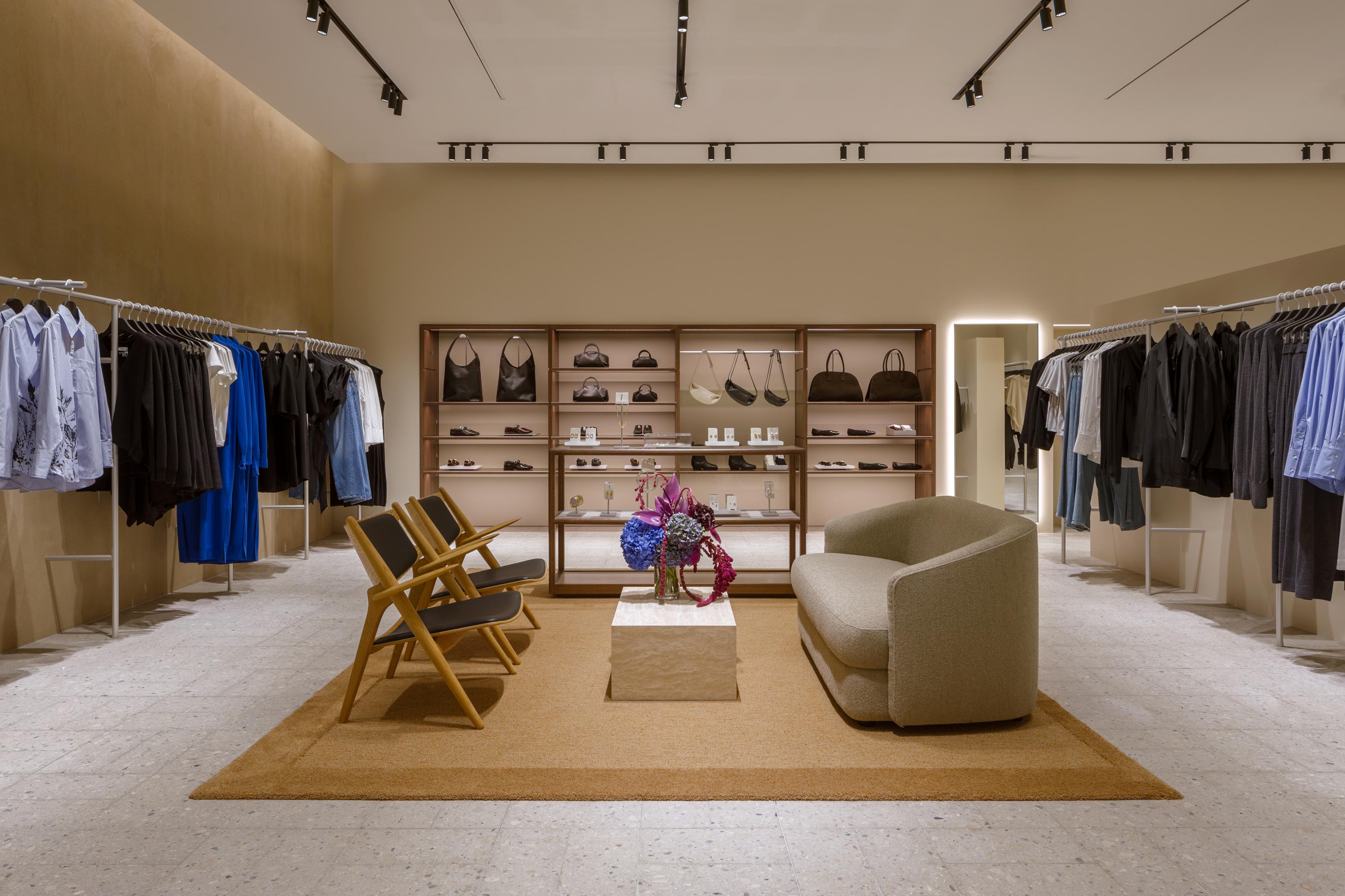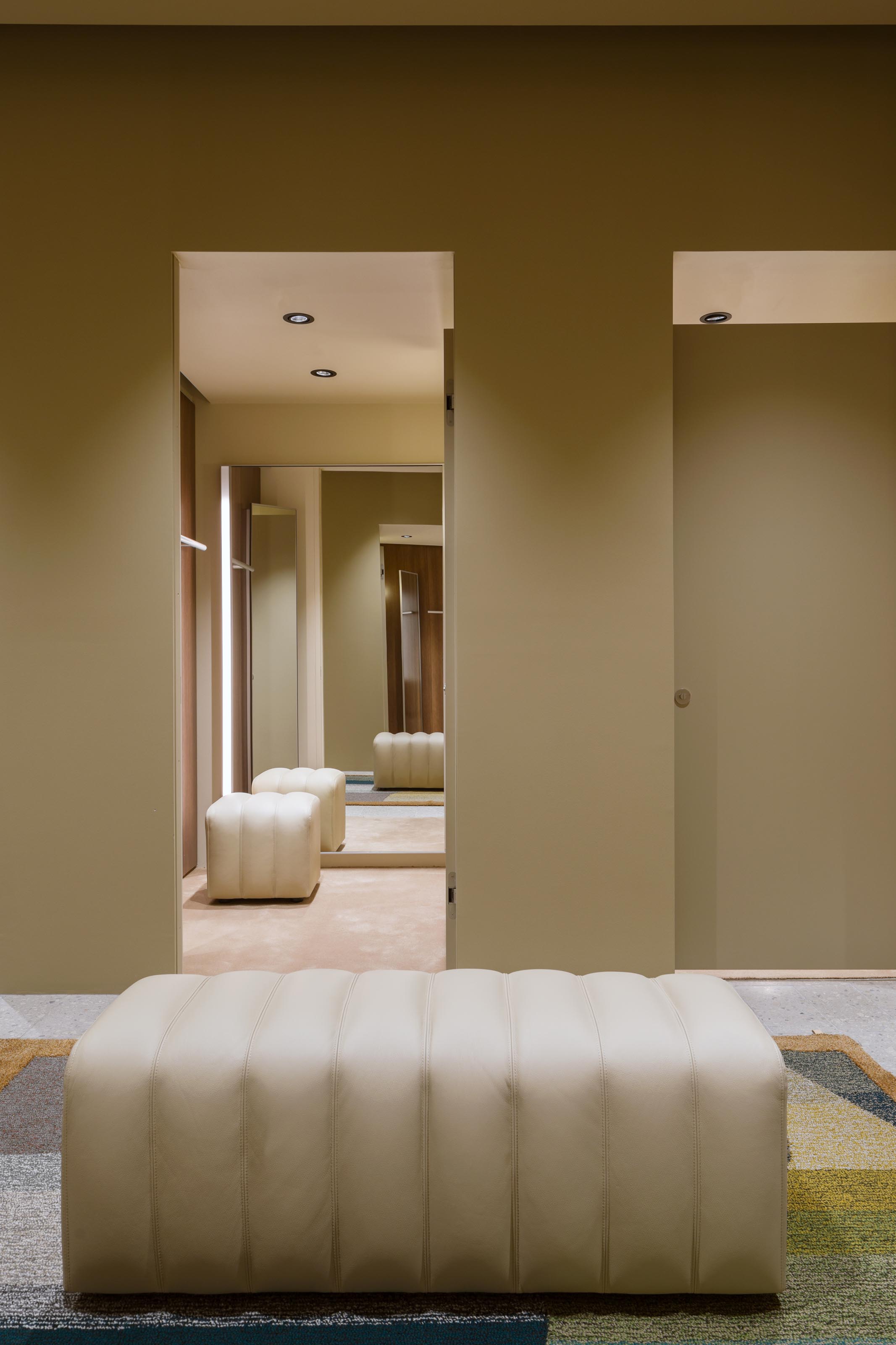W strefie wypoczynkowej znajdują się krzesła autorstwa Jonasa Lutza, a także ławki i pufy studia NOR11, obite ekologiczną skórą Sørensen, które tworzą delikatny kontrast z nowoczesnymi, ciemnymi, drewnianymi meblami w przymierzalniach. Dodatkowo, pastelowe kinkiety i lampy stołowe Bon Bon od Helle Mardahl kreują ciepłą i przytulną atmosferę w całym sklepie.