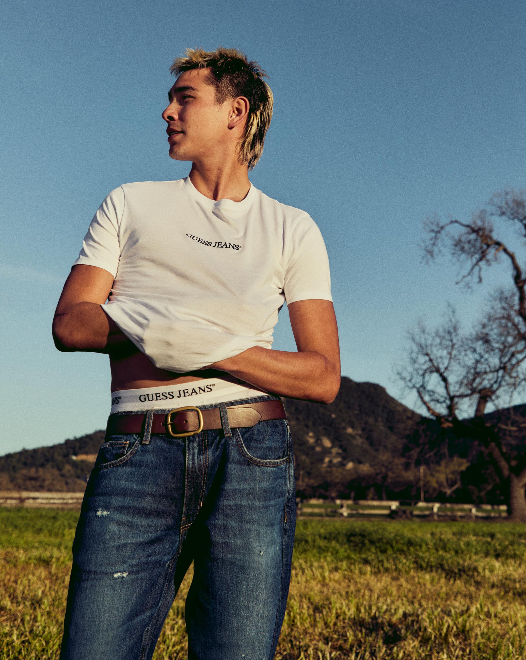 Urodzony na Hawajach Evan Mock to postać, której nie trzeba przedstawiać. Model, aktor, deskorolkarz, surfer, fotograf, a wcześniej także… nurek, pływający z rekinami – zaistniał w 2019 roku, gdy Frank Ocean opublikował jego zdjęcie na Instagramie. Znany z kolekcjonowania coraz to nowych „tytułów” w swojej karierze, dopisuje właśnie kolejny: „gwiazda kampanii GUESS JEANS”.